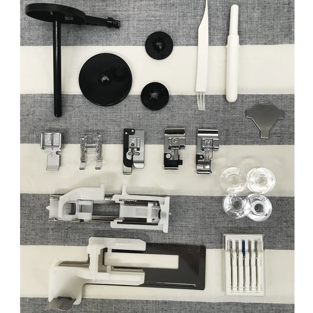 基本押え(A)ミシンに取り付け、ファスナー押え(E)、サテン押え(F)、ボタンホール押え(R)、安定板、安定ホルダー、まつり縫い押え(G)、たち目かがり押え(C)、ふちかがり押え(M)、糸コマ押え(大)2個 ※1個は本体にセット、糸コマ押え(小)2個、補助糸立て棒、ボビン4個、ミシン針(HA×1 #11×2, 14×2, ブルー針×1)、シームリッパー、ミシンブラシ、ドライバー、取り扱い説明書 ※※こちらのミシンにはフットコントローラーやワイドテーブルは 付属しておりません。 |