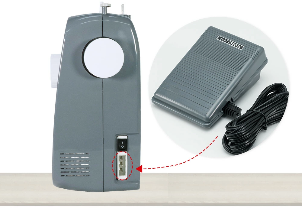 コンピューターミシンや電子ミシンはフットコントローラーとミシン本体に設置されているスイッチの両方でミシンを操作できる場合が多いですが、電動ミシンの場合にはどちらか1つのみの超シンプル設計。