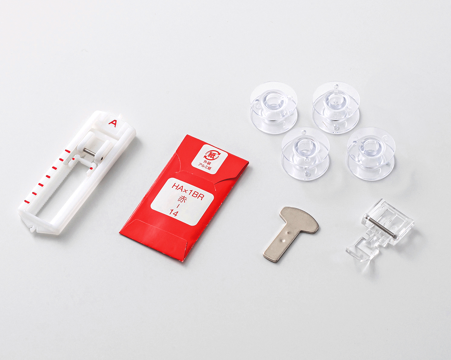 標準押え(ミシンに取り付けてあります) 片押さえ / ボタンホール押え / ねじ回し / ボビン4個 / 針セット(#14・3本)/ フットコントローラー / 取扱説明書 / 操作早見表 / 保証書 |