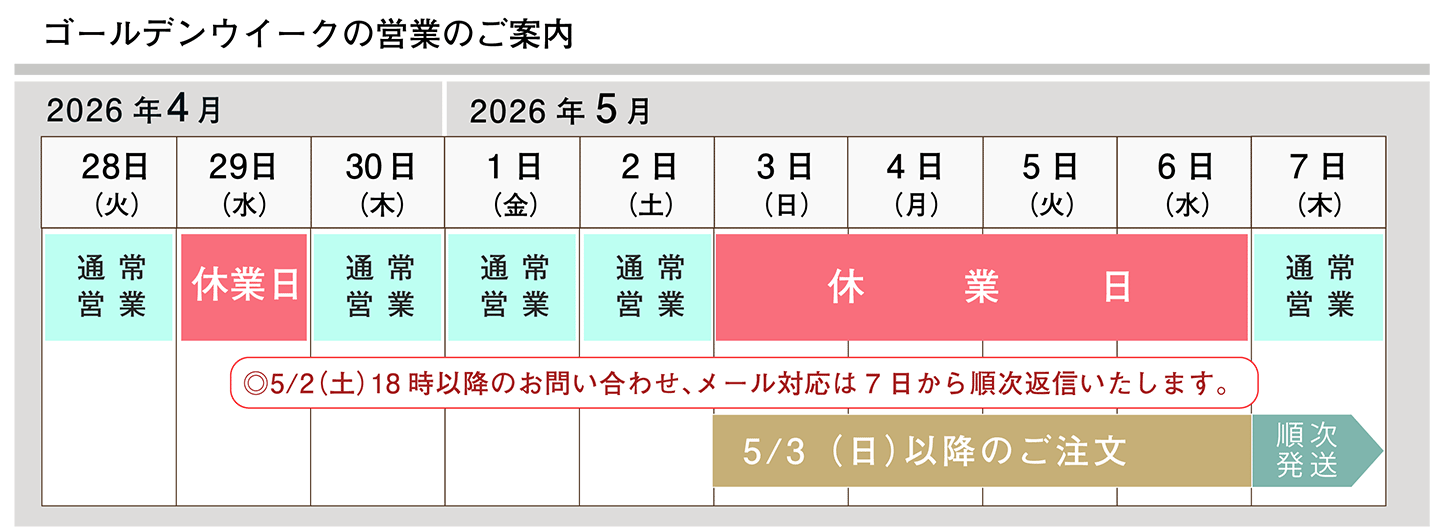 トップ > お知らせ > ゴールデンウイーク期間中の営業日のお知らせ 2026.04.17
