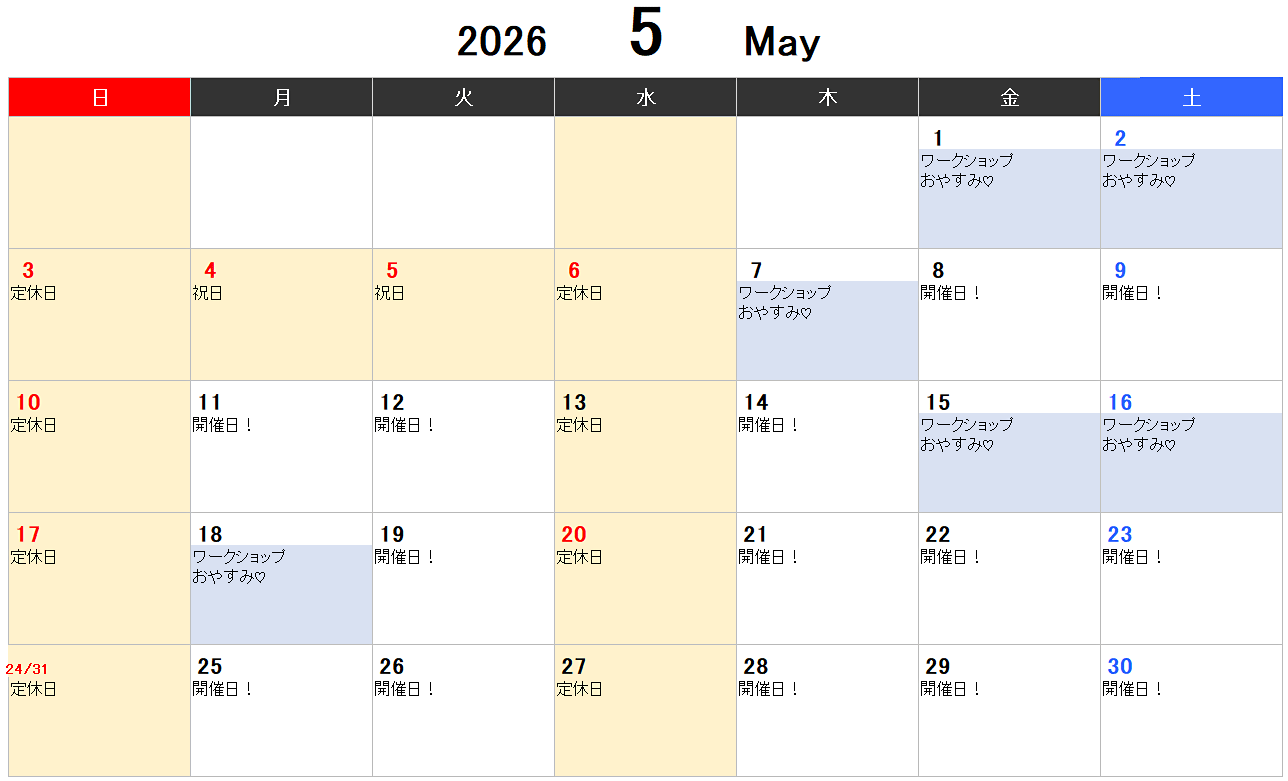 ピンク色で塗られた日にちが、定休日となります。