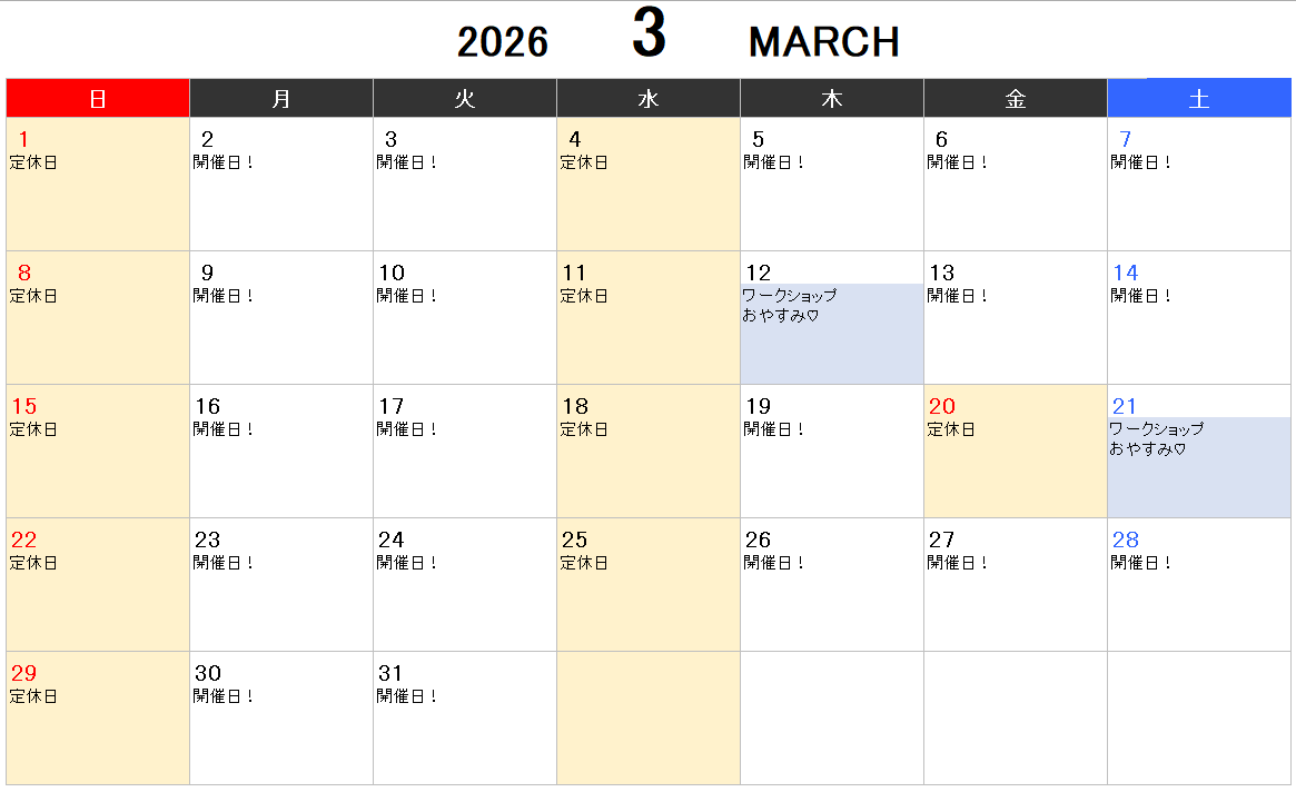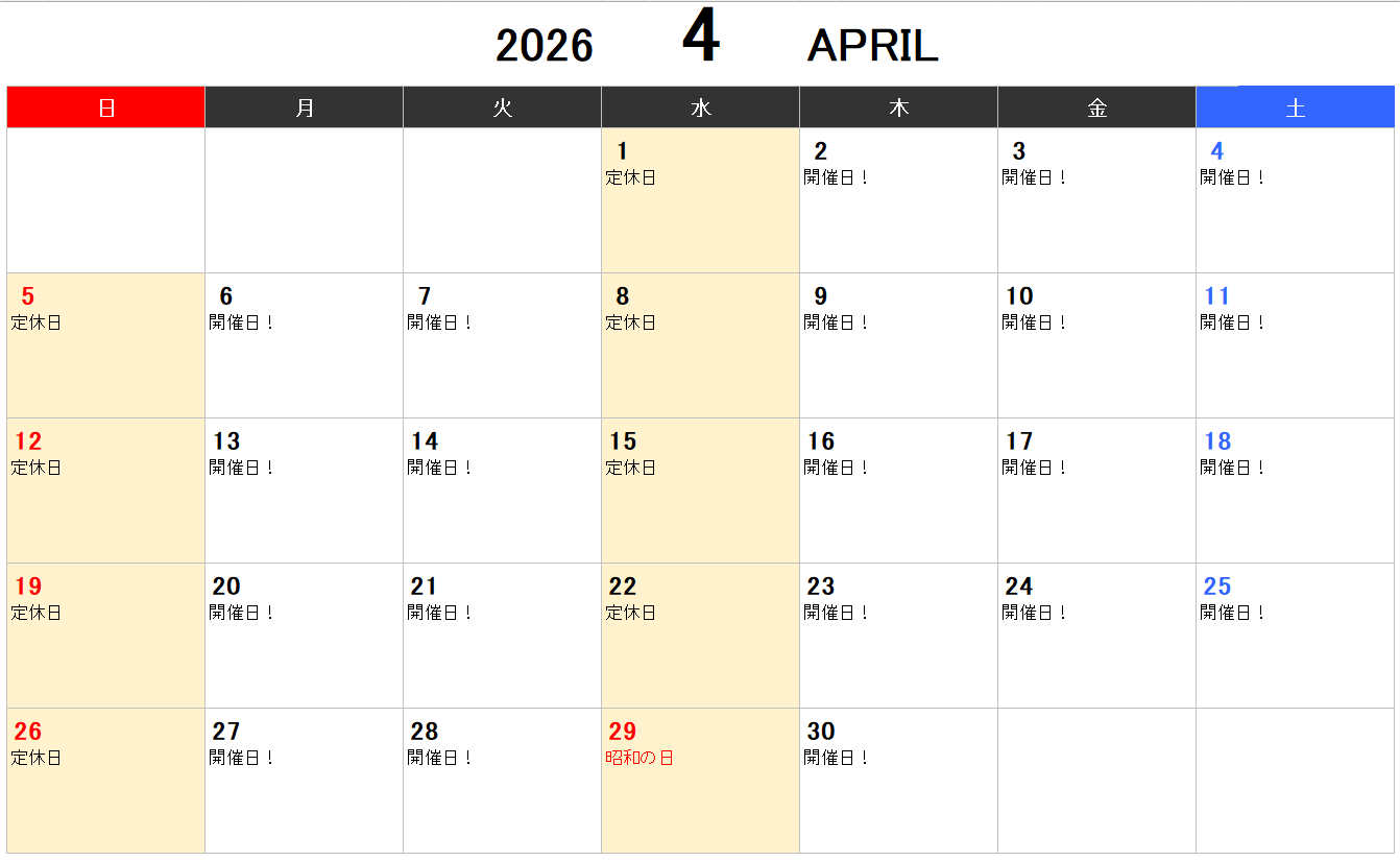 ピンク色で塗られた日にちが、定休日となります。